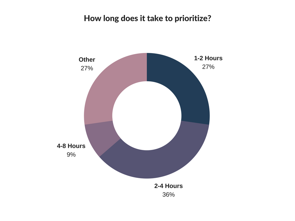 36% of SaaS companies told us they spend 2 to 4 hours each time they prioritize. This was closely followed by 27% who take 1 to 2 hours. Another 27% specified “Other”, and finally 9% said it takes them 4-8 hours. The companies who answered with “Other” fell either side of the other answers, with some companies even taking weeks to prioritize.